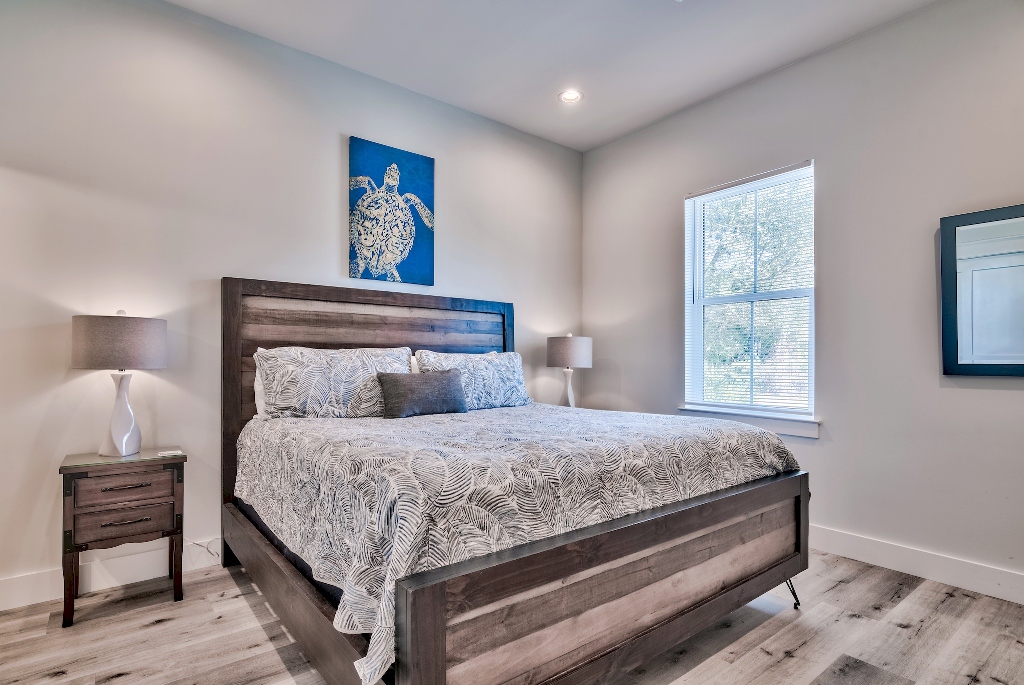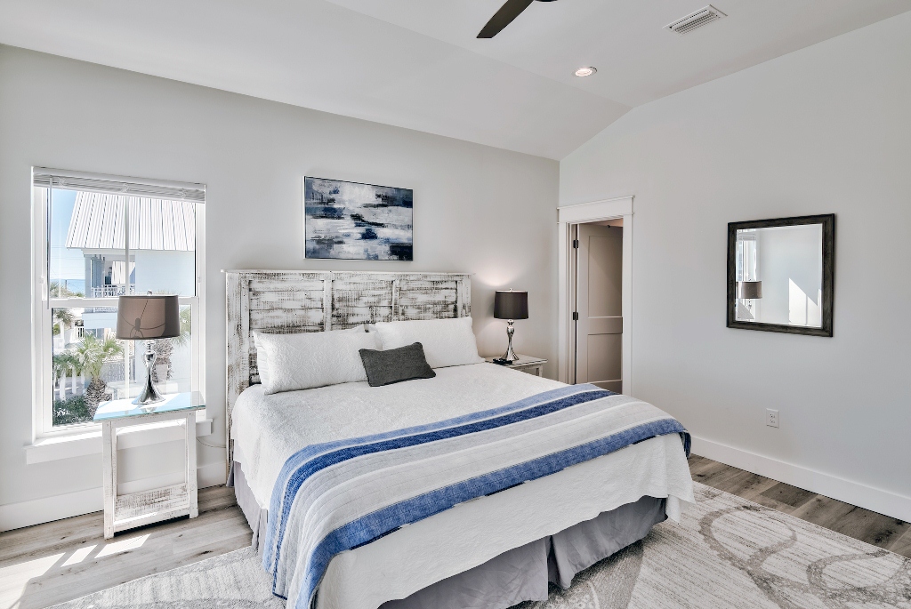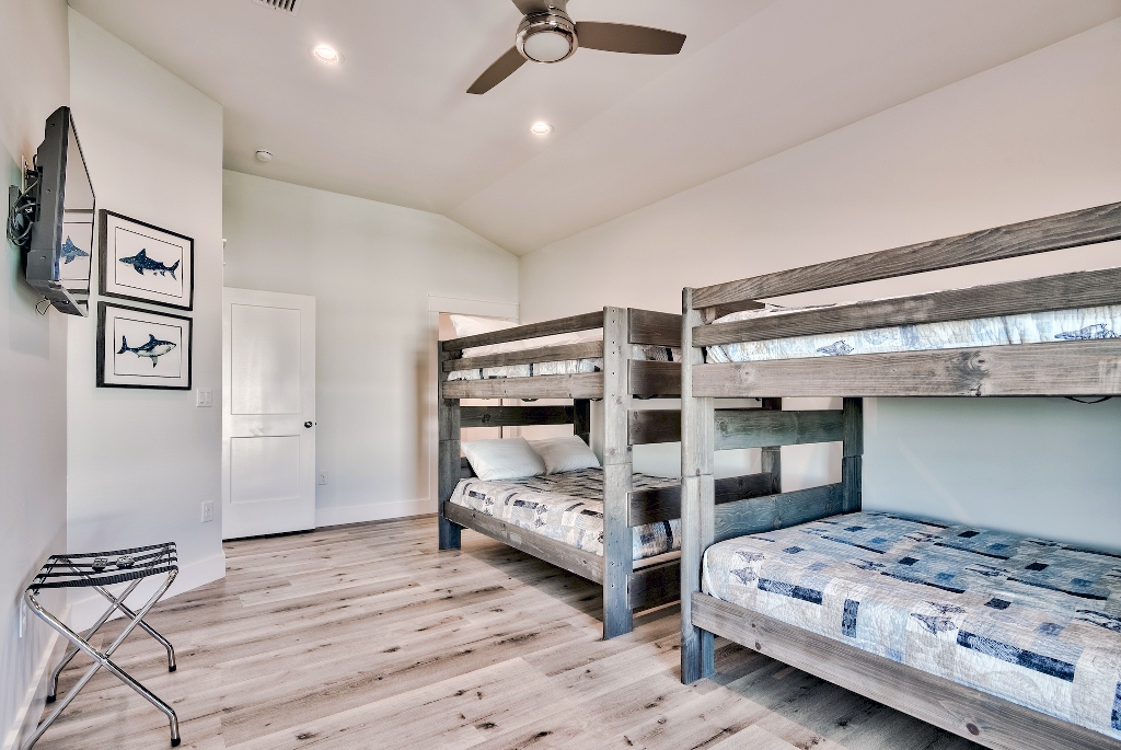 The 2nd floor features 4 master king suites (1 of which also contains a custom Firetruck twin bunk) with private bathrooms, tiled showers with seamless glass doors. French doors lead to the expansive covered beach view balconies with comfortable seating for your morning coffee or sunset cocktails.