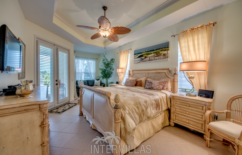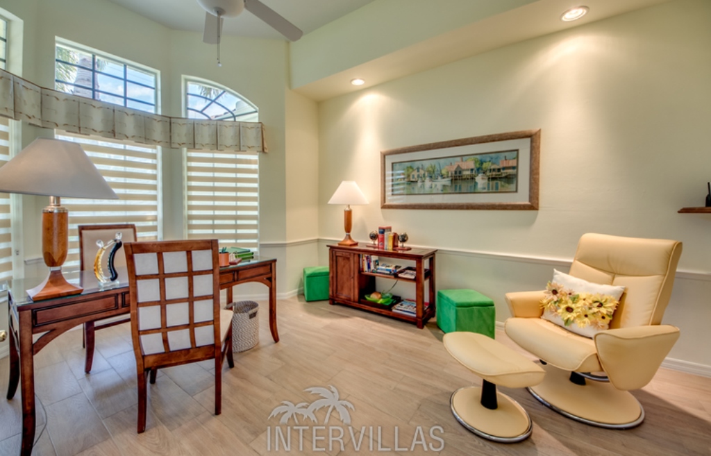 The patio furniture consists of a granite table with 6 chairs, a console table, 4 loungers with side tables and 2 bar chairs and is custom made. The lanai also has dimmable light for a romantic evening.
