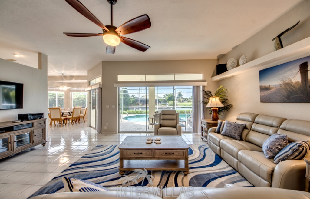 Modern and light furnished living room with a breathtaking view over the lanai and the water canal. Big glass sliding doors can be opened almost fully and give the feeling of living outdoors.